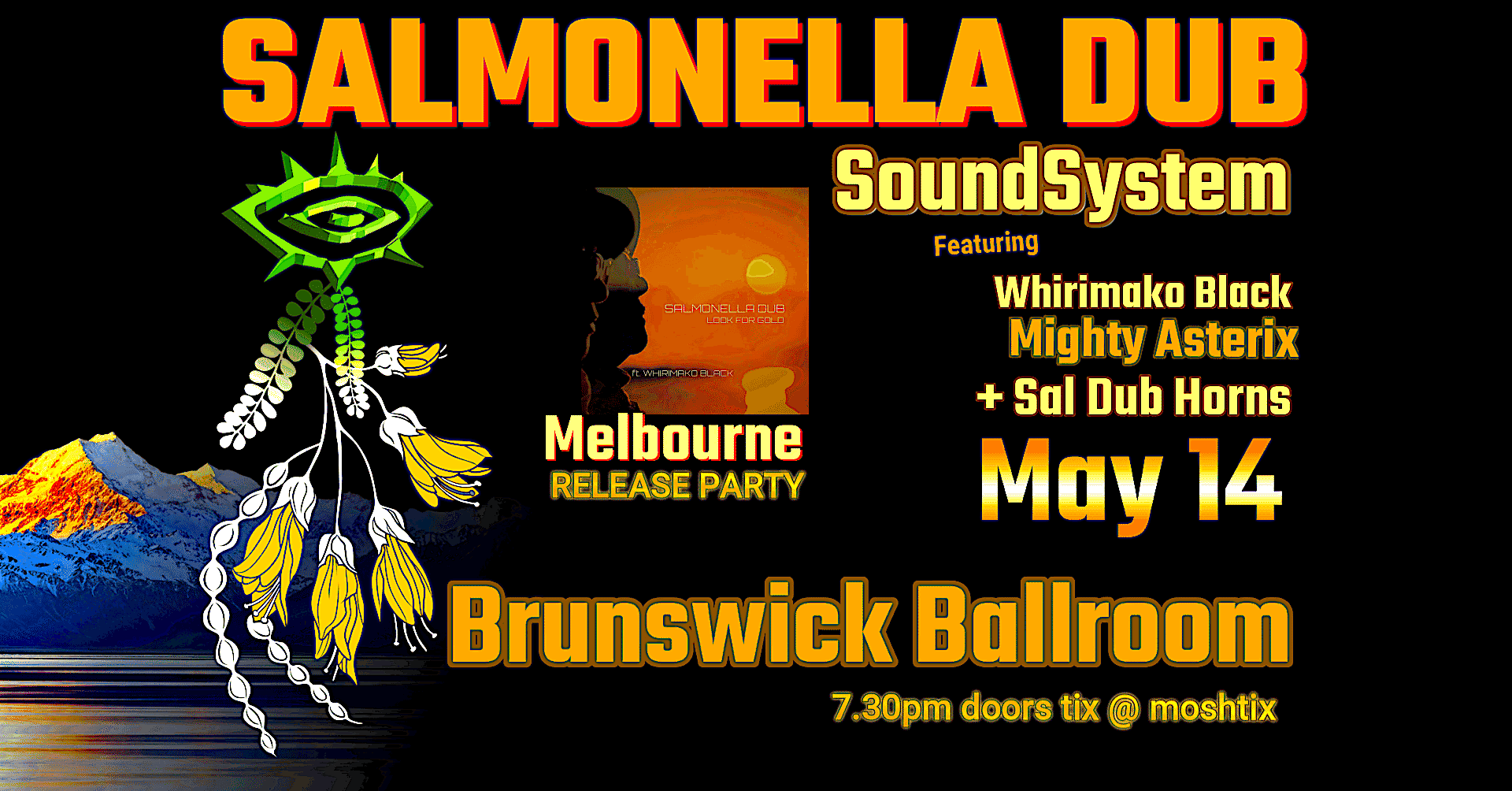 Salmonella Dub originator Andrew Penman (aka Dj Rudeboy) drives the Sal Dub SoundSystem Machine featuring the Mighty Asterix & Whirimako Black on vocals with the epic Sal Dub horn section live. Prepare for an audio visual dance floor journey through the bands new albums For All Things Alive from the bands catalogue of Dub house, jungle plus nu album tracks from Soul Love Trippa - Return To Our Kōwhai & For All Things Alive.